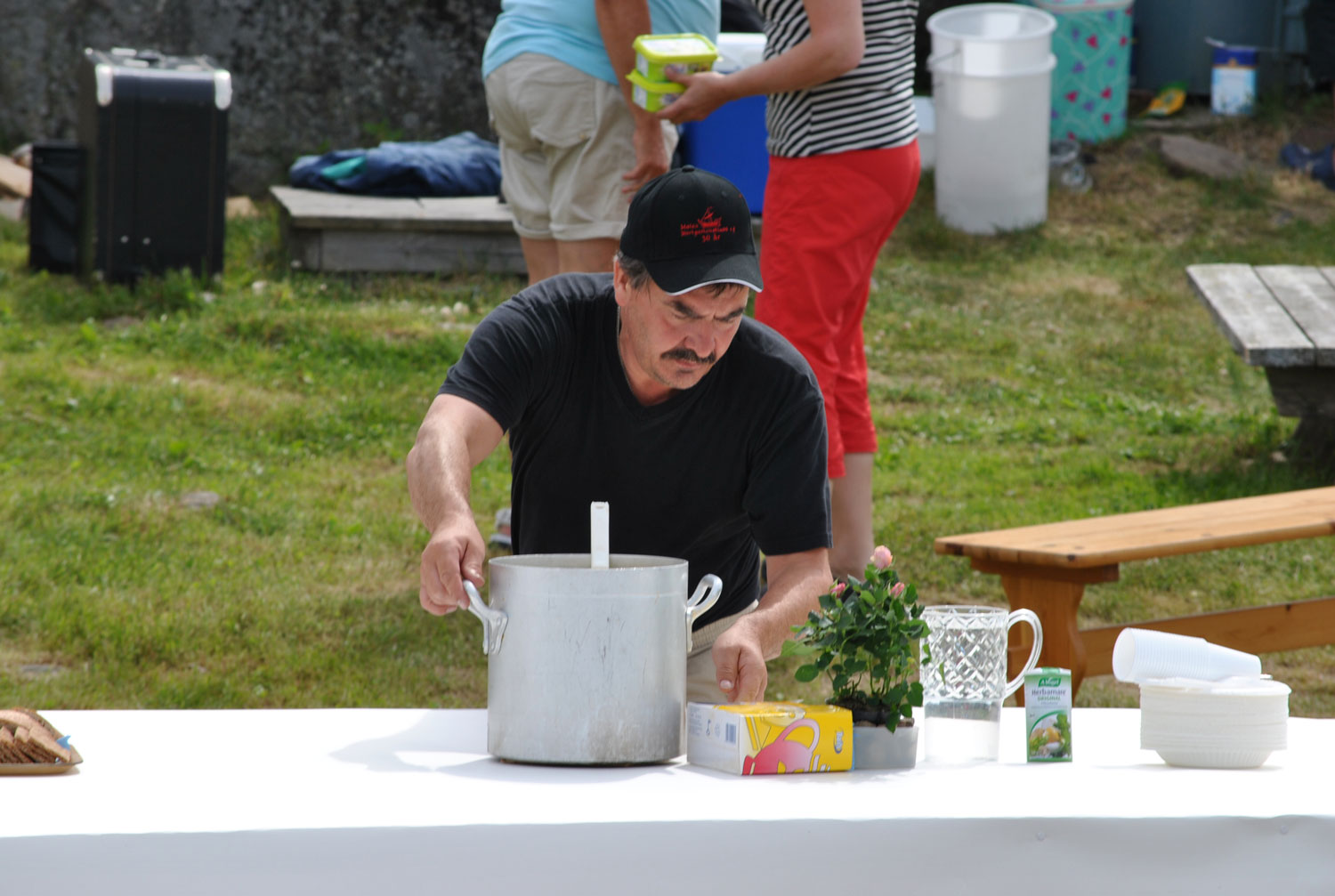 Väl framme vid Storskär serverades laxsoppa varvat med lättsamt program såsom dragspelsmusik,lite historik från åren som gått samt stövelkastning o korvgrillning.